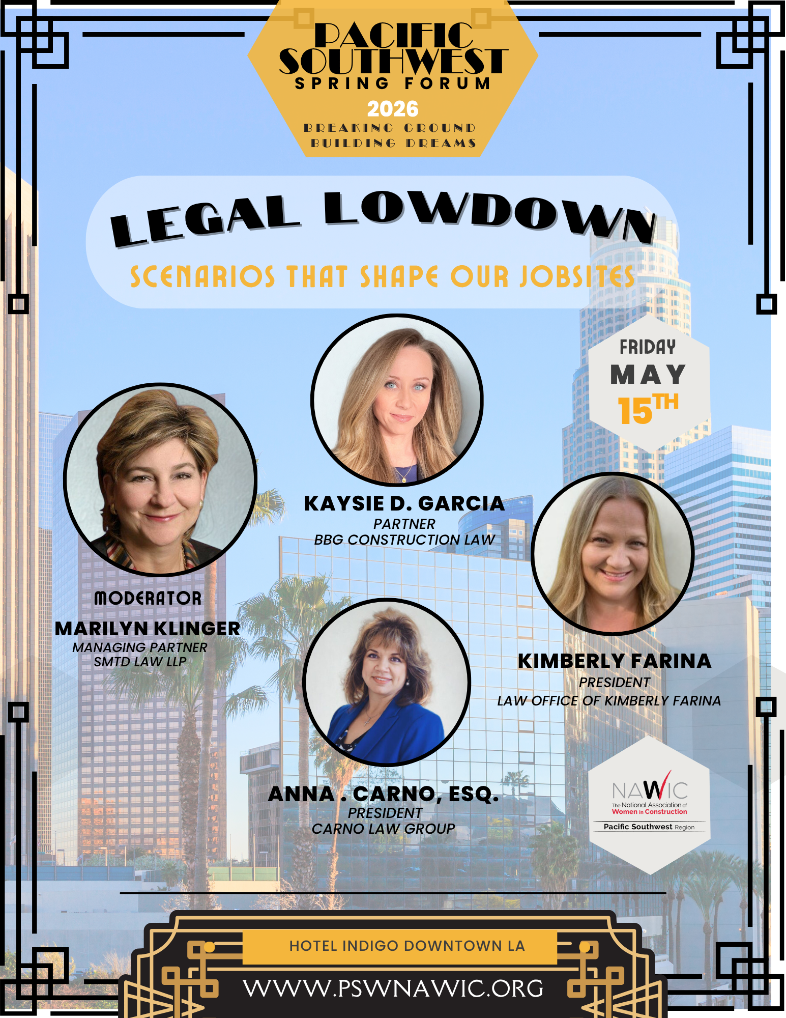 . Join us for a fast-paced, interactive panel designed specifically for women in construction, focused on the legal issues, risks, and decisions that directly impact your projects and your role. This session brings construction law out of the abstract and into the realities of the jobsite, providing practical insight attendees can immediately apply in their day-to-day work.