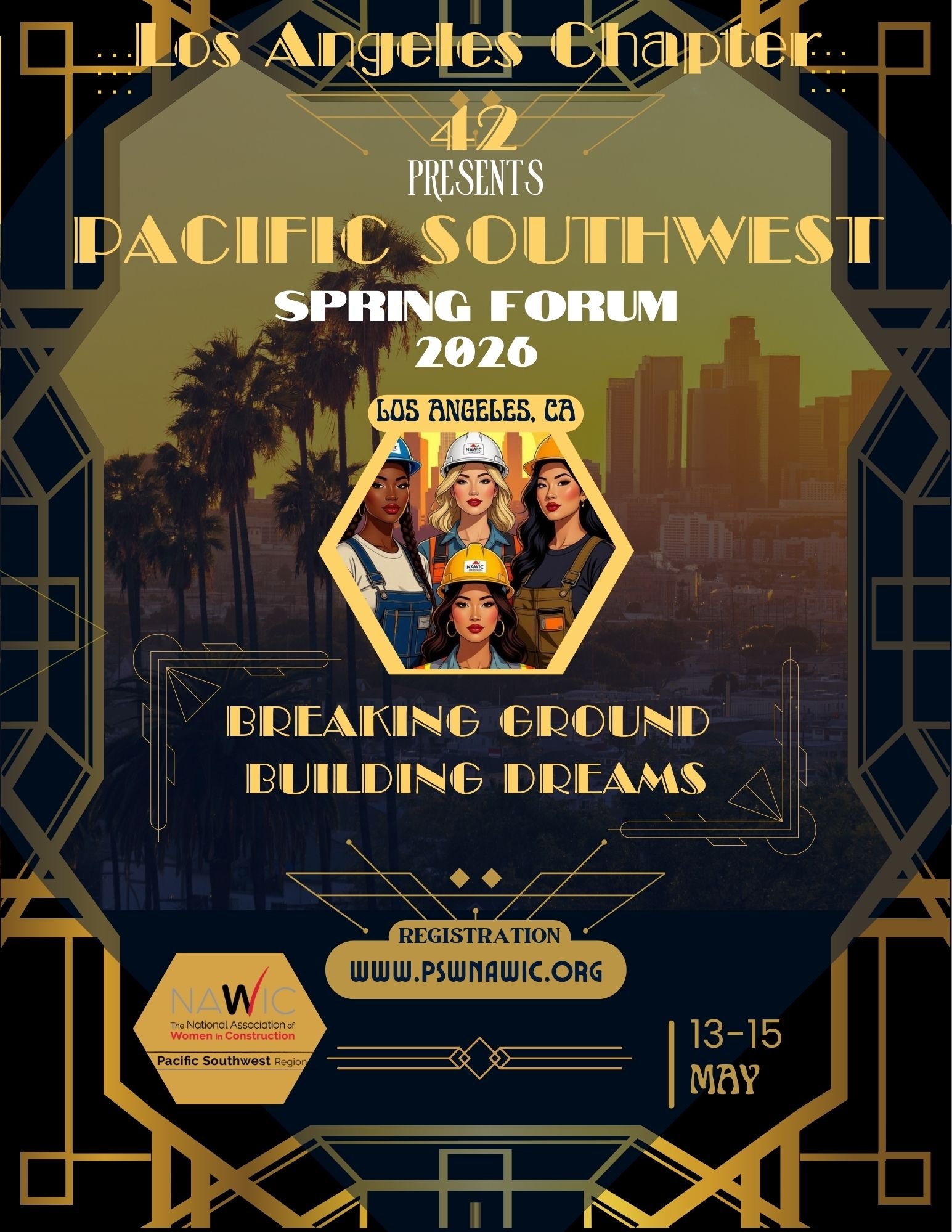 The NAWIC Pacific Southwest Region Spring Forum 2026, hosted by the NAWIC Los Angeles Chapter #42, will take place May 13–15, 2026, at the Hotel Indigo Los Angeles Downtown in Los Angeles, California.